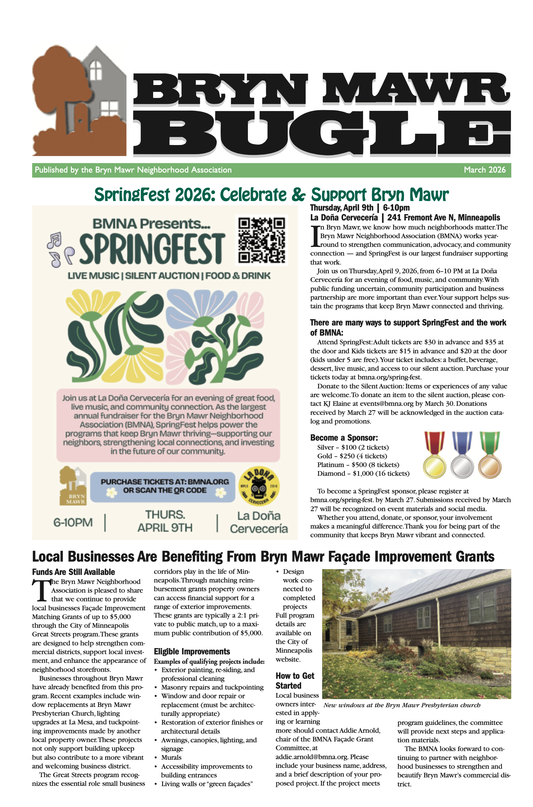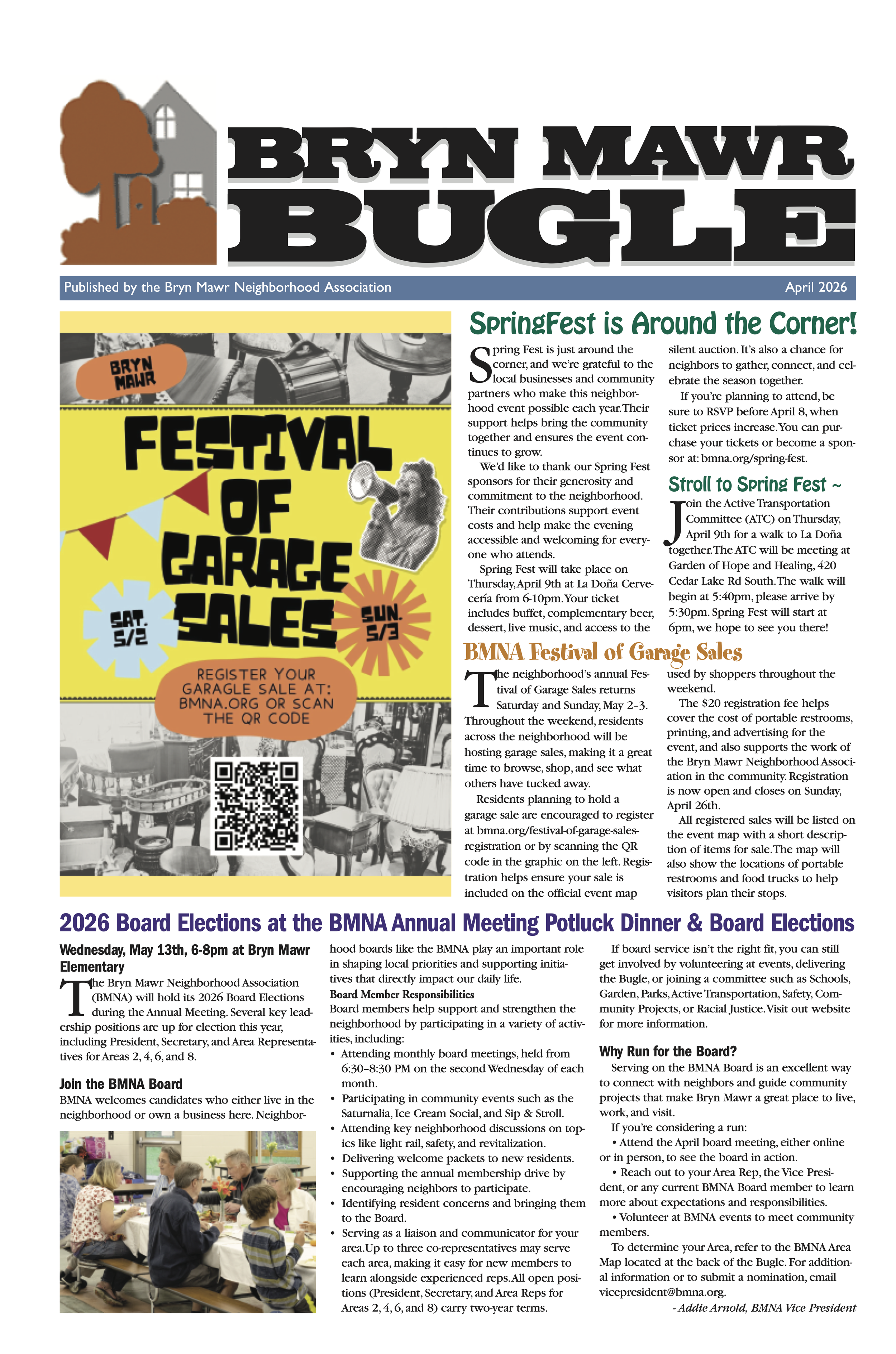 The Bryn Mawr Bugle is published monthly, except in January, by the Bryn Mawr Neighborhood Association (BMNA). It is the official newsletter of the BMNA. Distribution is free to Bryn Mawr residents.