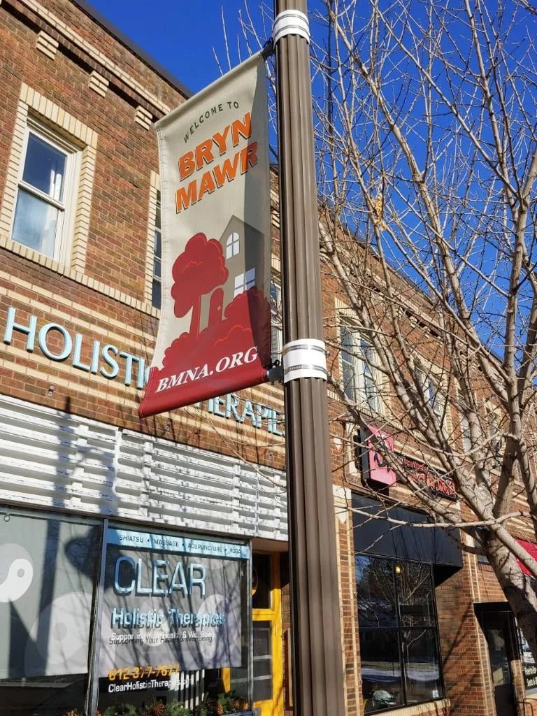 Downtown banner project. Part of a joint City of Minneapolis/BMNA NRP project, four banners identifying Bryn Mawr displayed from light posts in downtown Bryn Mawr.